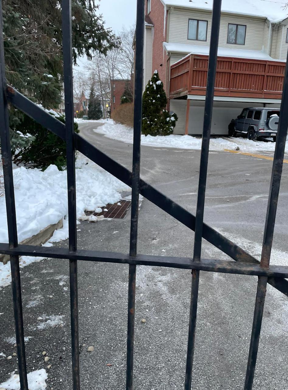 The community faces inward. The Penn Avenue sidewalk runs along their outer boundary wall — it's the public's path, not the one residents see from inside the gates. But it's still their responsibility.